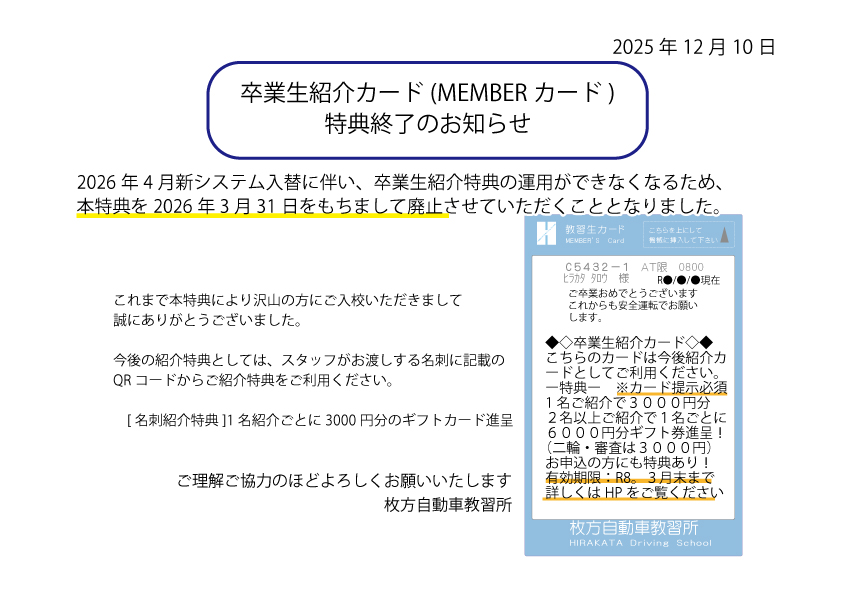 ひらキョーメンバーカード特典廃止のお知らせ