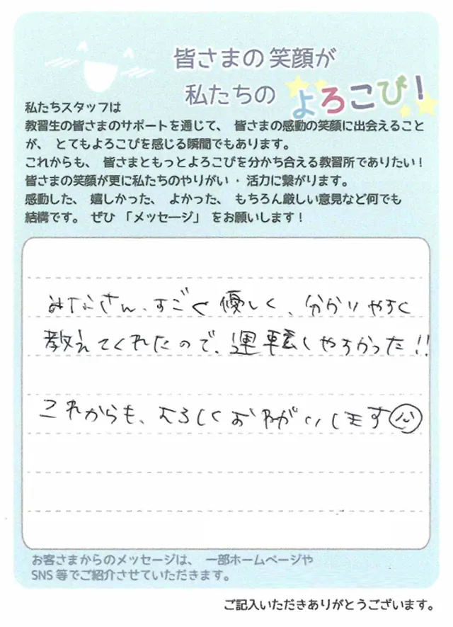 長い間大変お世話になりました。運転が苦手だったので、他の人よりも時間がかかりましたが先生方はいつも分かりやすく伝えてくれました。休みの日には必ず来ていたので少し寂しく感じます。皆さんありがとうございました。森口先生の「最後まで頑張って」の一言がとても嬉しかったです♡