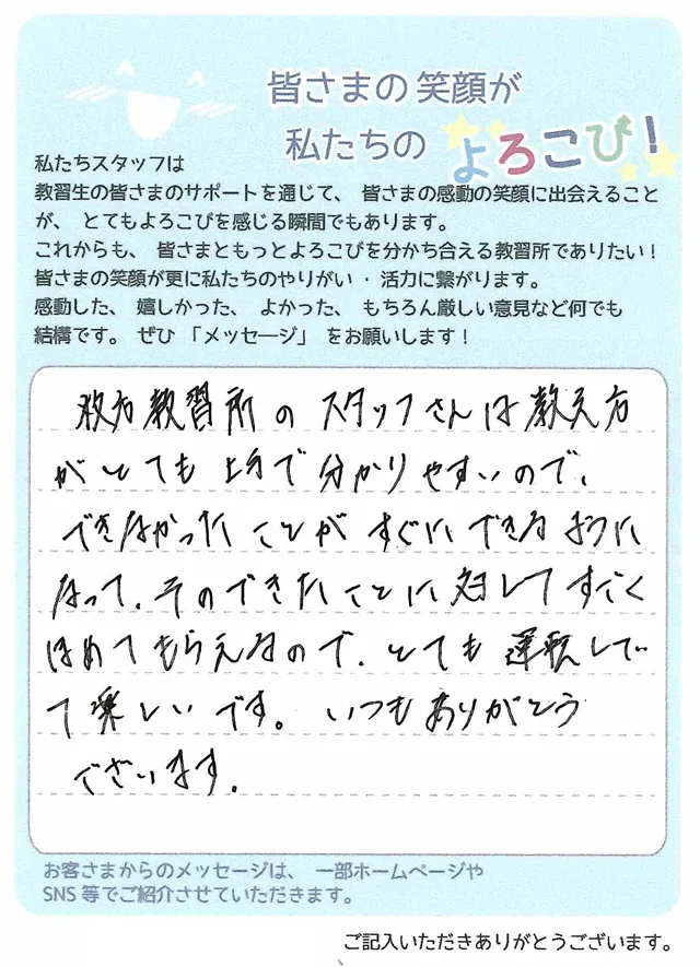 指導員の方や受付の方、皆さんがとても丁寧に教えて下さったので、怖かった運転が今では日々のストレスを発散できるくらい楽しんで運転できています。ありがとうございます。