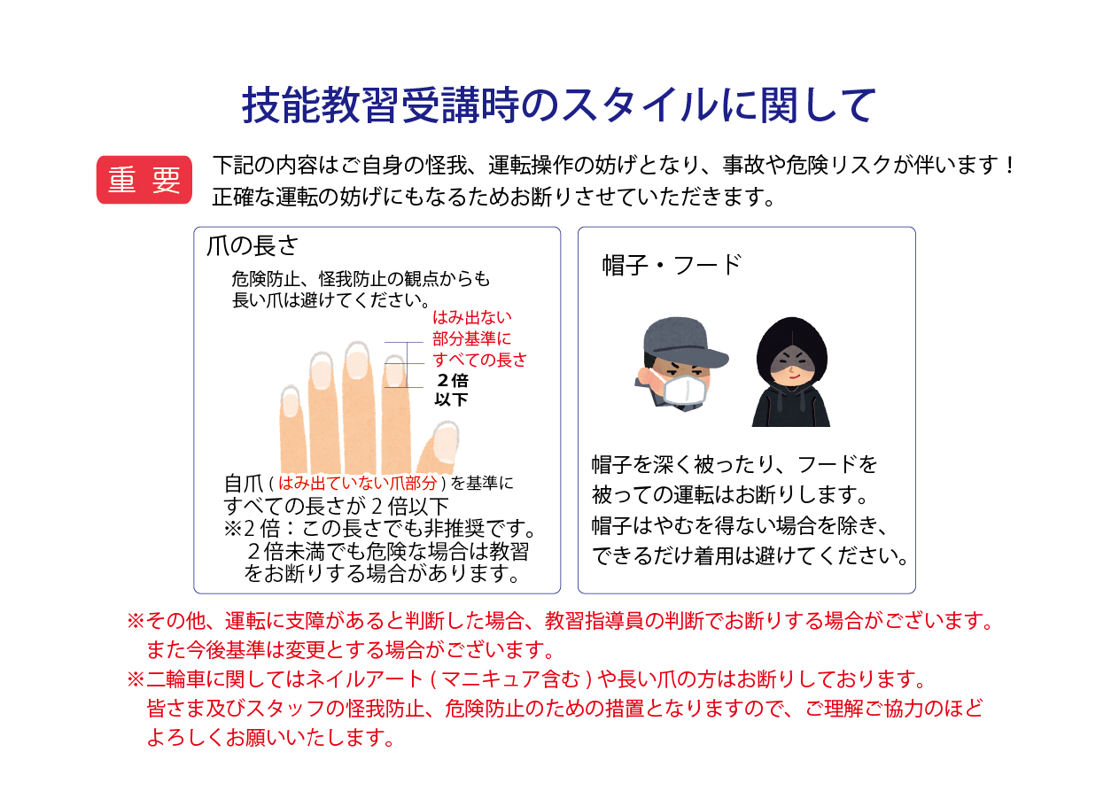 その他、これだけに限らず運転に支障があると判断した場合、教習指導員の判断でお断りする場合がございます。また今後基準サイズなど変更となる場合がございます。